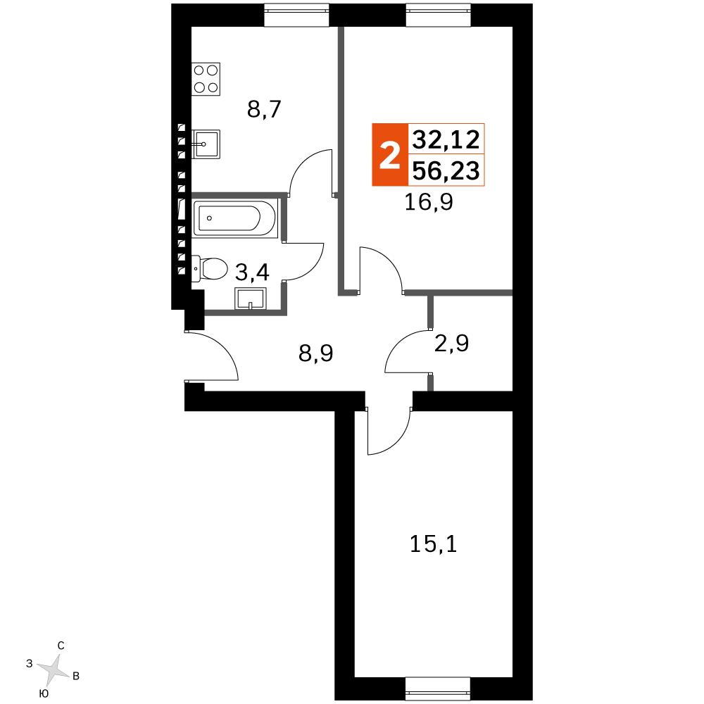 2-комн · 56 м² · 4 эт.