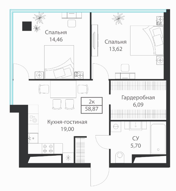2-комн · 59 м² · 9 эт.