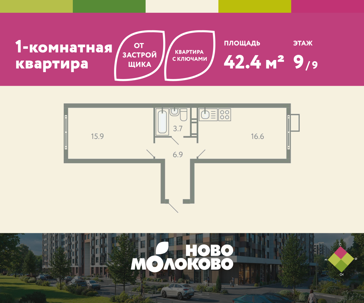 1-комн · 42 м² · 9 эт.