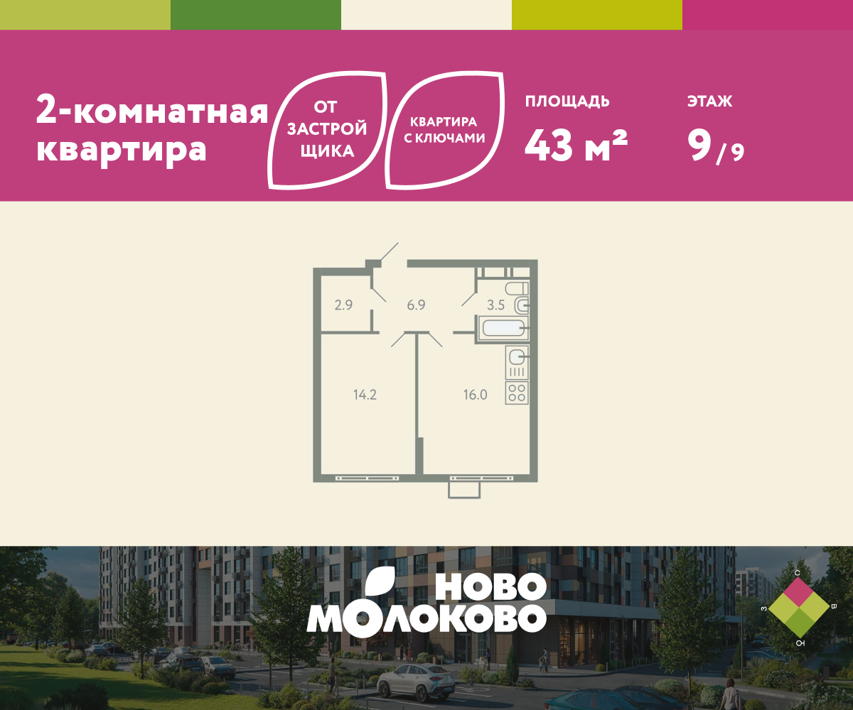 2-комн · 43 м² · 9 эт.