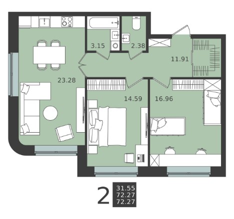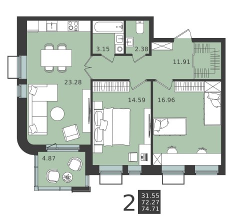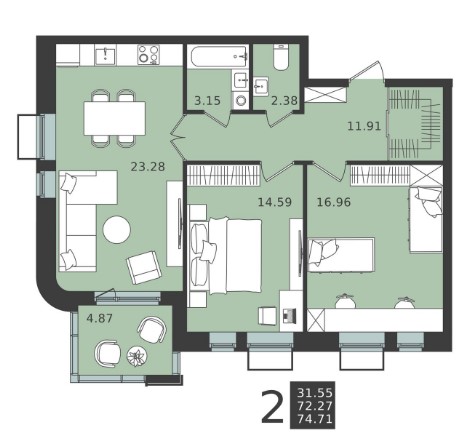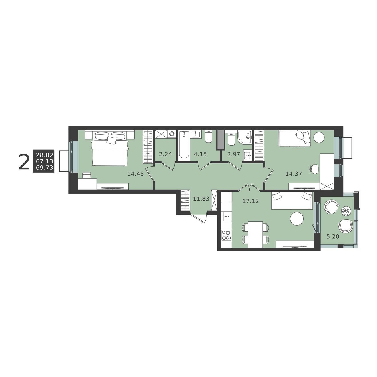 2-комн · 69 м² · 2 эт.
