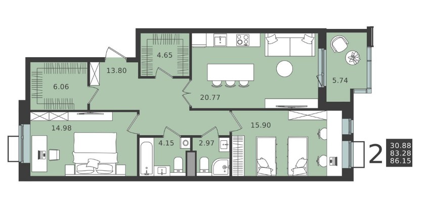 2-комн · 86 м² · 2 эт.