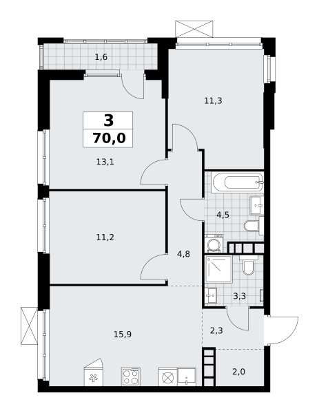 3-комн · 70 м² · 22/30