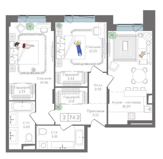 2-комн · 74 м² · 2/14
