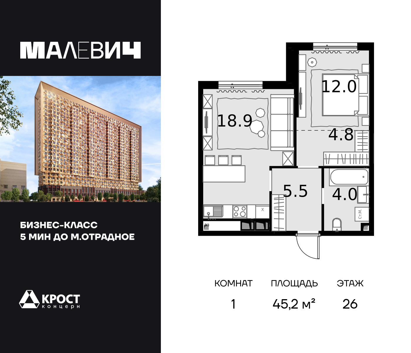 1-комн · 45 м² · 26 эт.