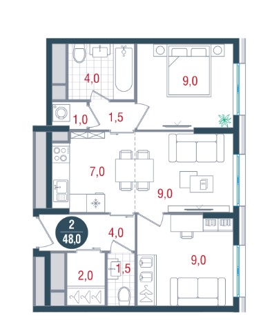 2-комн · 48 м² · 13 эт.