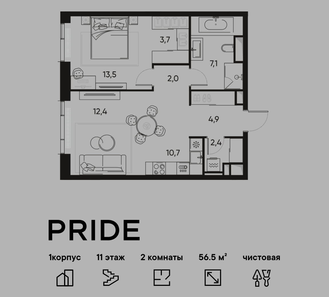 2-комн · 57 м² · 11/22