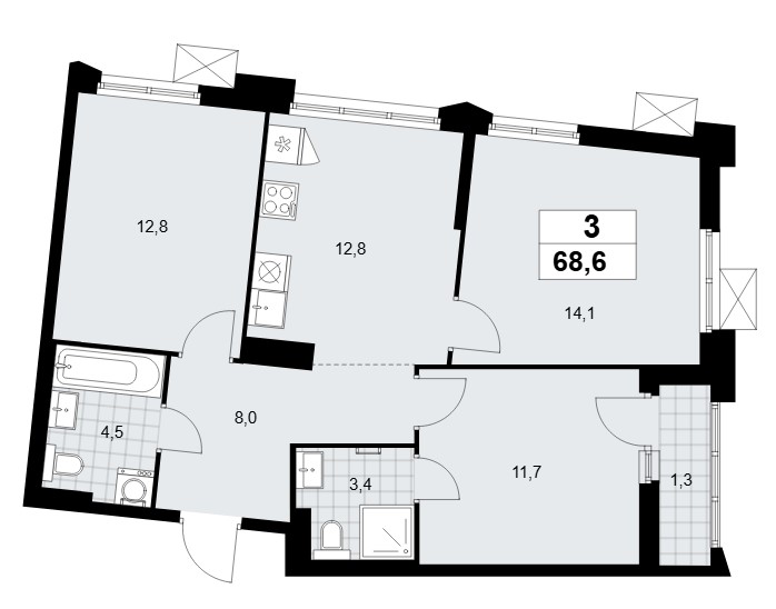 3-комн · 69 м² · 11/22