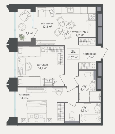 3-комн · 72 м² · 2/25