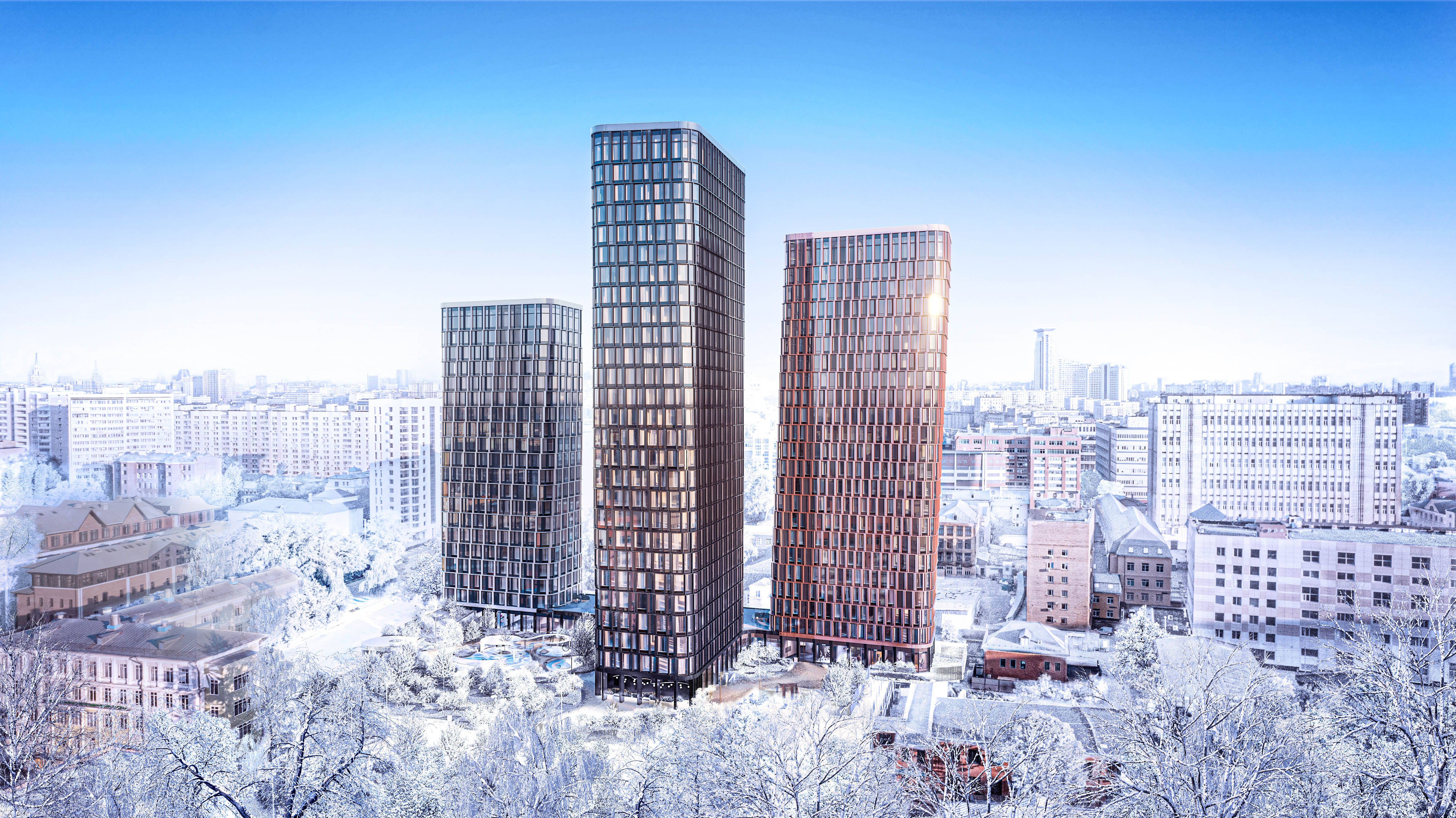 "Дом 56" - новый проект премиум-класса от Галс Девелопмент. Три 22-29-этажных корпуса будут отделаны металлическими панелями, а остекление будет в пол на всех этажах. Каждый корпус будет своего цвета, всего предусмотрено три варианта: никель, медь и железа. Архитектурную концепцию разработало бюро PRIDE, все корпуса будут с эффектом "закручивания", что достигается смещением окон на каждом этаже относительно соседних этажей.