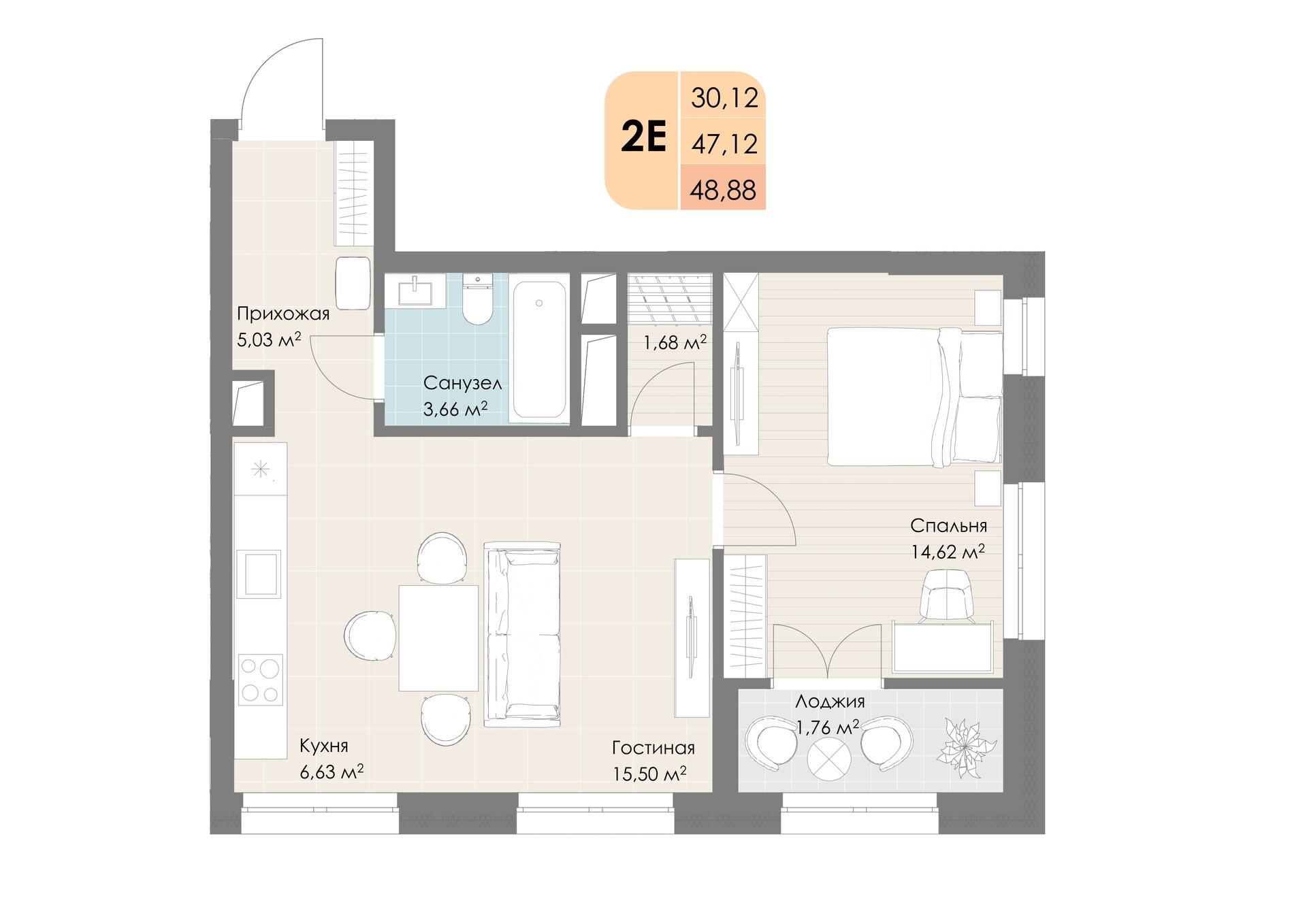 Студия · 48 м² · 15/30