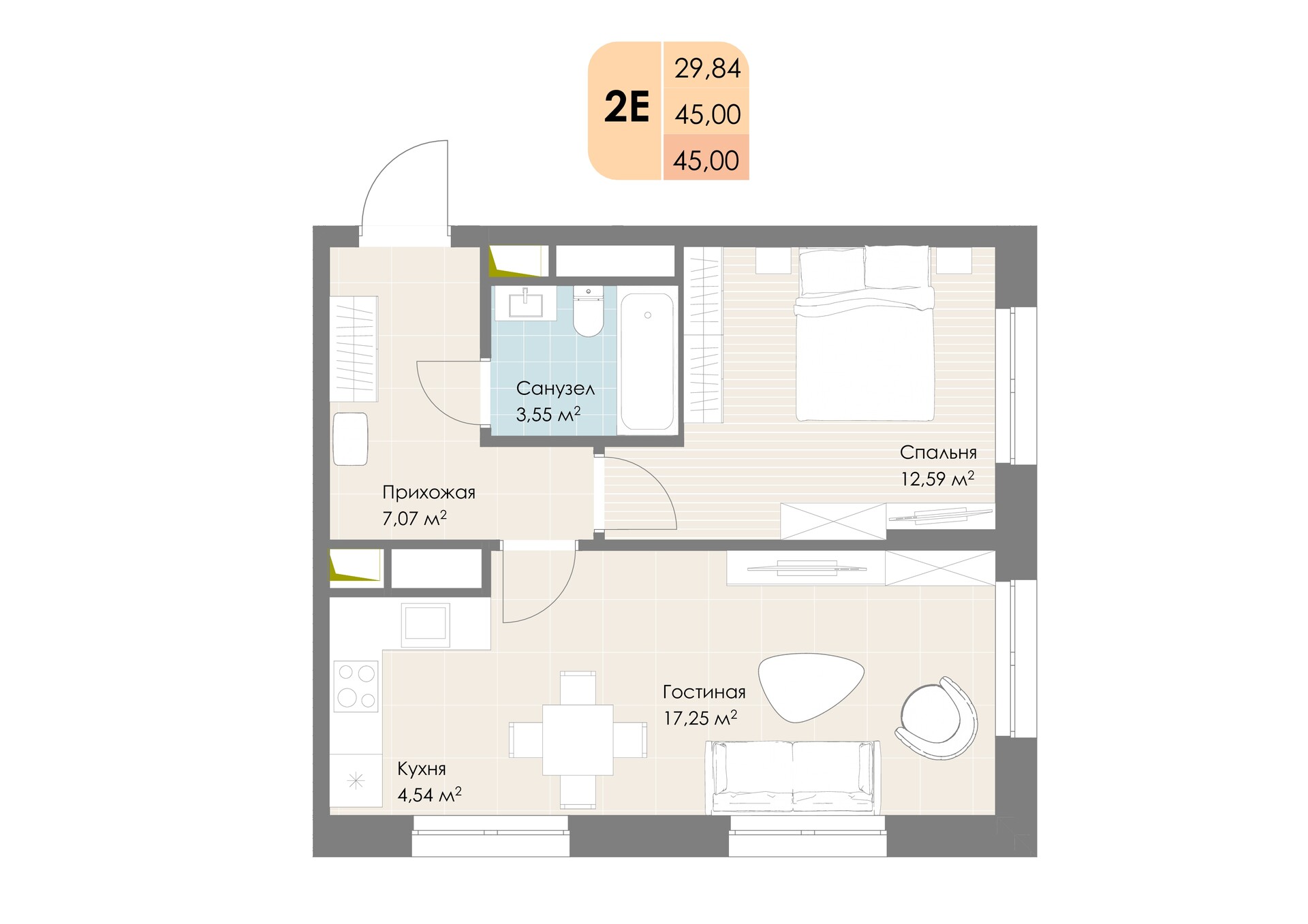 Студия · 45 м² · 20/30