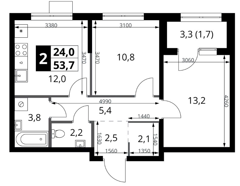 2-комн · 54 м² · 2/18