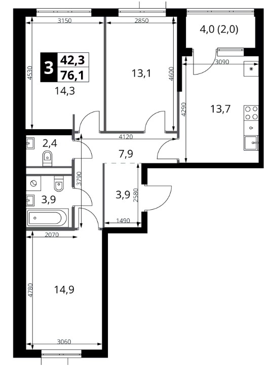 3-комн · 76 м² · 2/18
