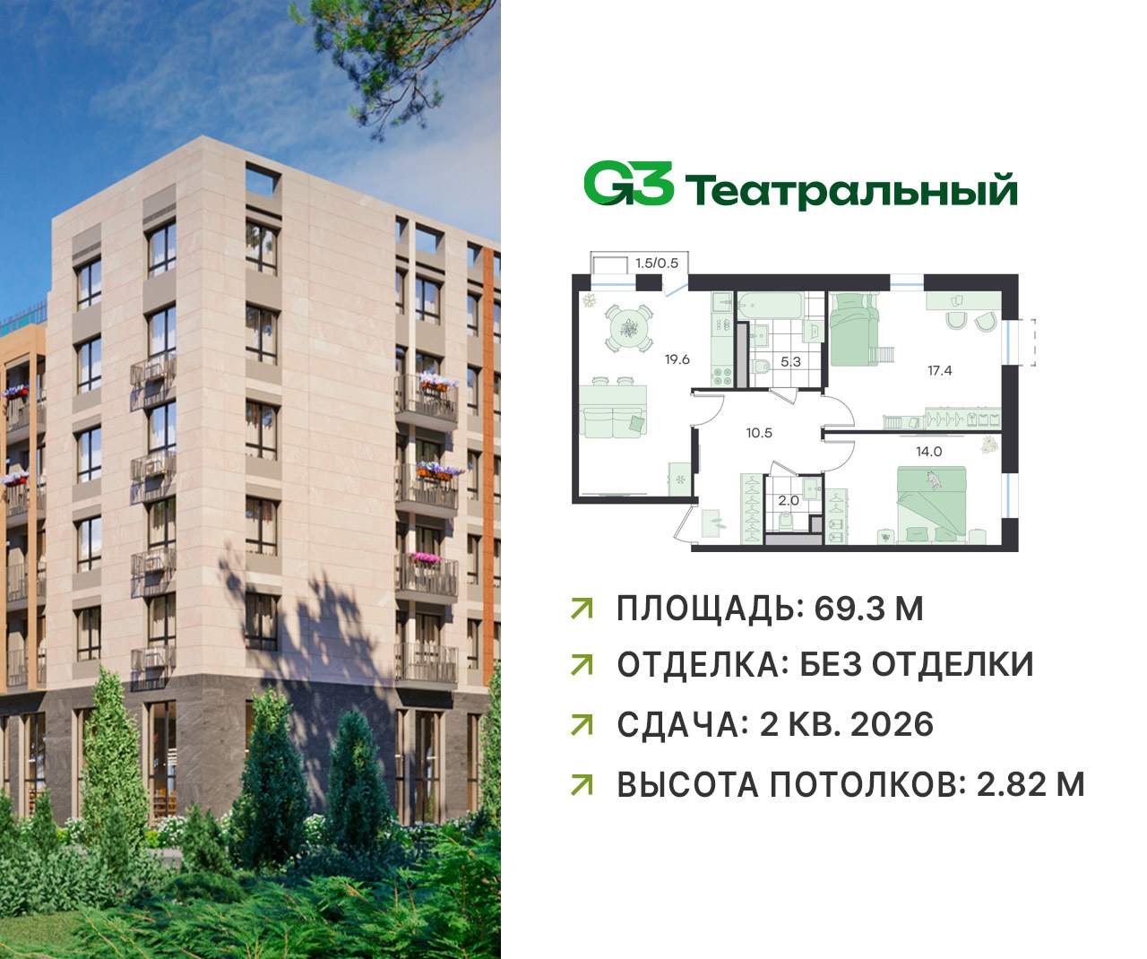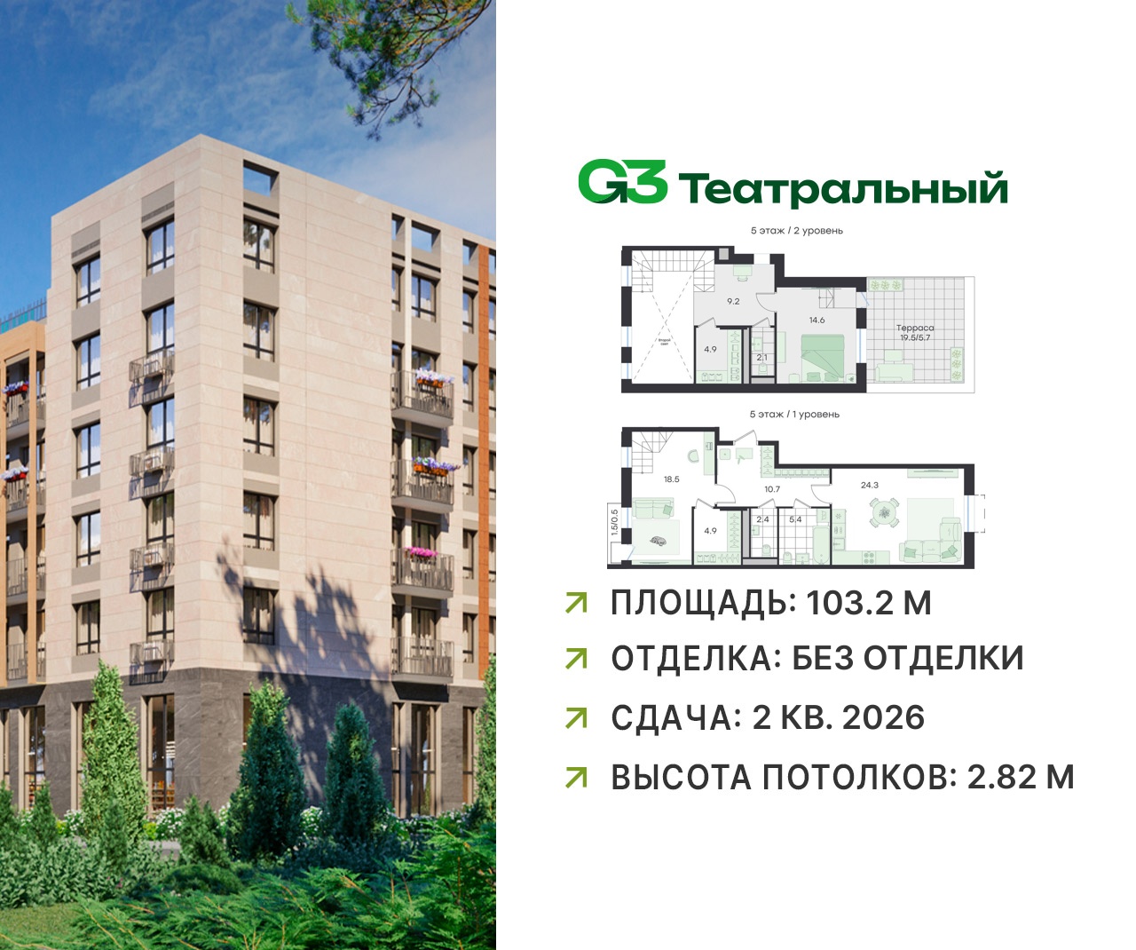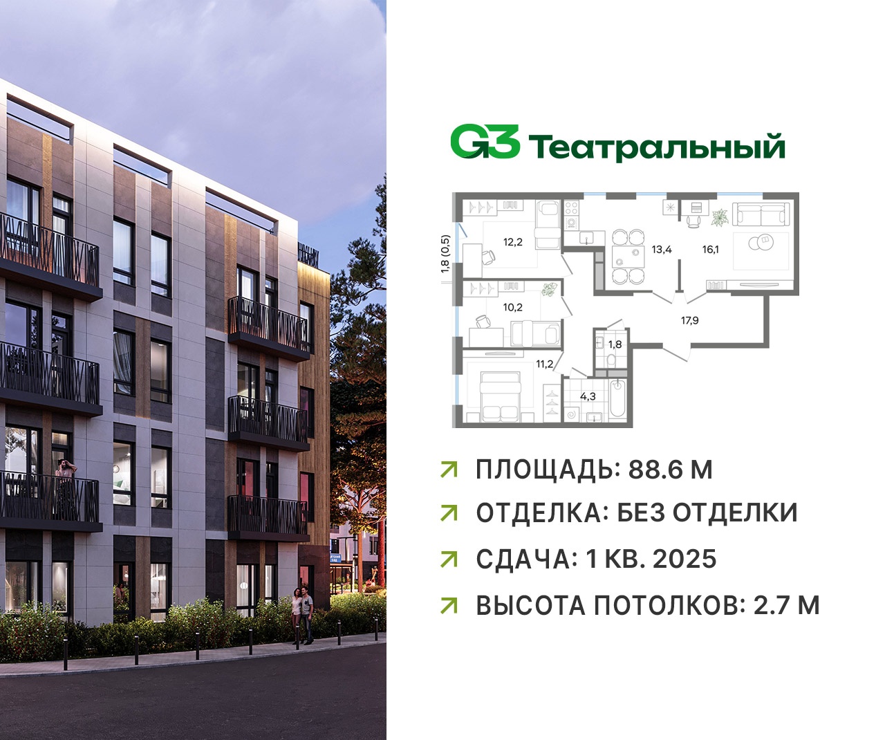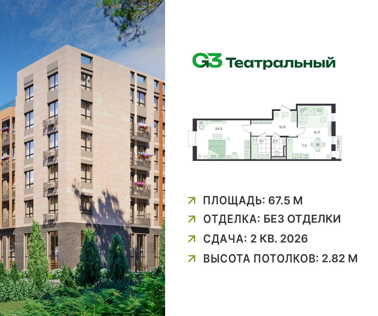 ЖК "G3 Театральный" - пилотный проект девелопера G3 Group. Всего в комплексе бизнес класса запланировано два корпуса, в первом 4-этажном корпусе будет 224 квартиры в 11 секциях, по 6 квартир на этаже. Самая маленькая квартира - студия, площадью 28,2 кв.м, самая крупная - четырехкомнатная, площадью 87,20 км.в. Среди планировочных решений есть студии с балконом, однушки с раздельным санузлом, евро-двушки с "распашной" планировкой. Высота потолка зависит от этажа и секции, самые низкие потолки 2,82 м, самые высокие - 3,17 м. Застройщик предлагает на выбор три варианта отделки - черновой, предчистовой и чистовой. Чистовая отделка может быть выполнена в двух цветовых решениях.
