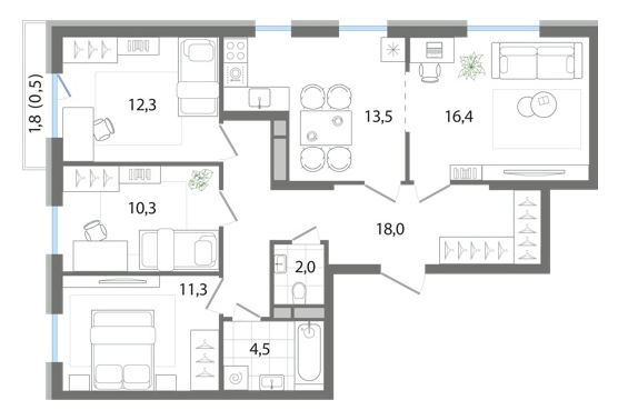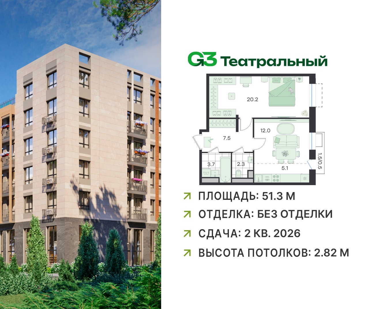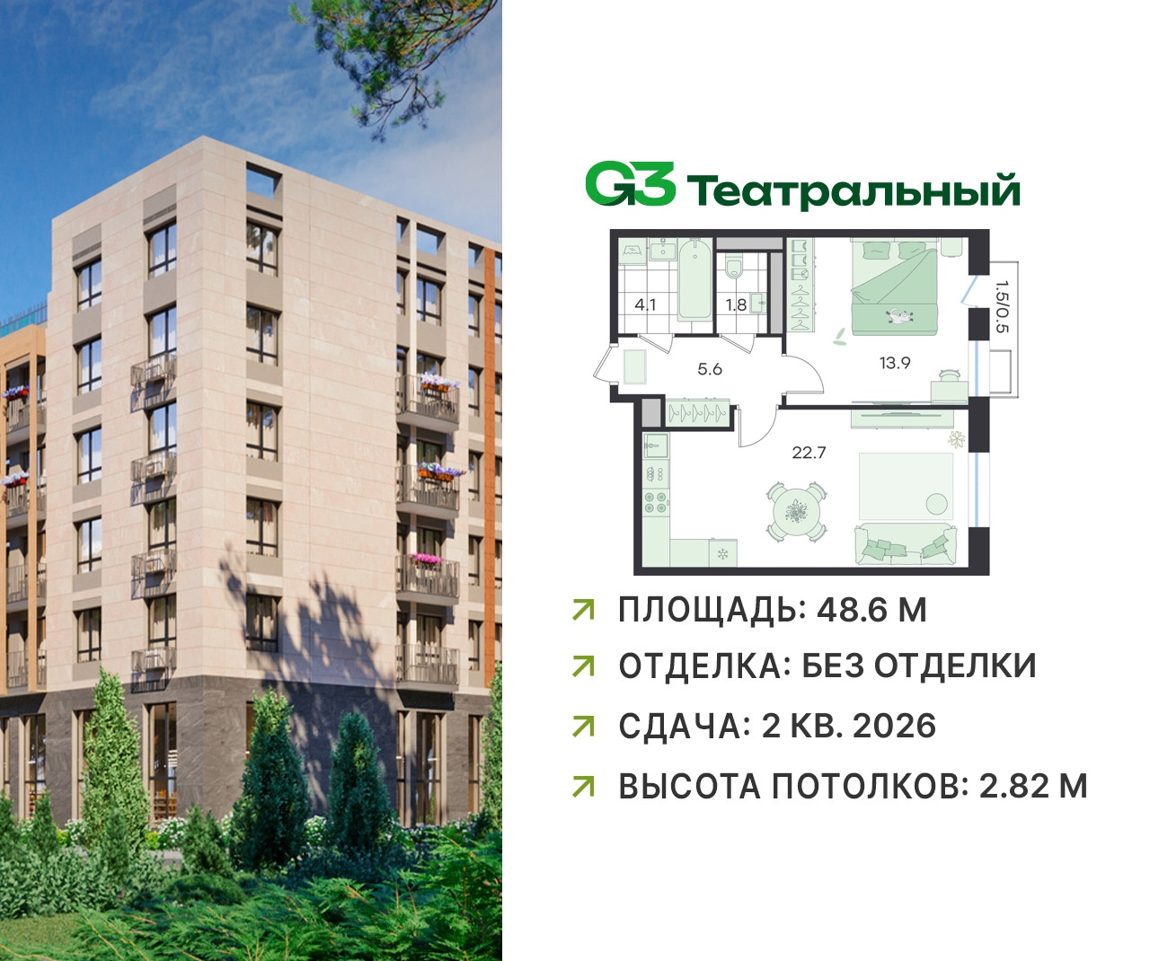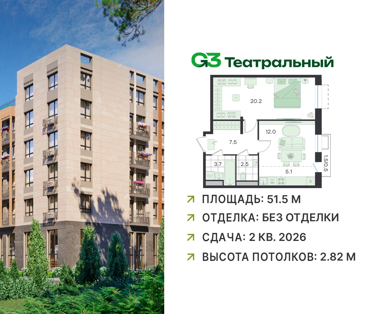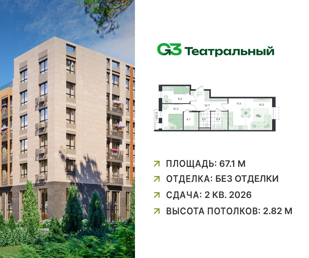 ЖК "G3 Театральный" - пилотный проект девелопера G3 Group. Всего в комплексе бизнес класса запланировано два корпуса, в первом 4-этажном корпусе будет 224 квартиры в 11 секциях, по 6 квартир на этаже. Самая маленькая квартира - студия, площадью 28,2 кв.м, самая крупная - четырехкомнатная, площадью 87,20 км.в. Среди планировочных решений есть студии с балконом, однушки с раздельным санузлом, евро-двушки с "распашной" планировкой. Высота потолка зависит от этажа и секции, самые низкие потолки 2,82 м, самые высокие - 3,17 м. Застройщик предлагает на выбор три варианта отделки - черновой, предчистовой и чистовой. Чистовая отделка может быть выполнена в двух цветовых решениях.