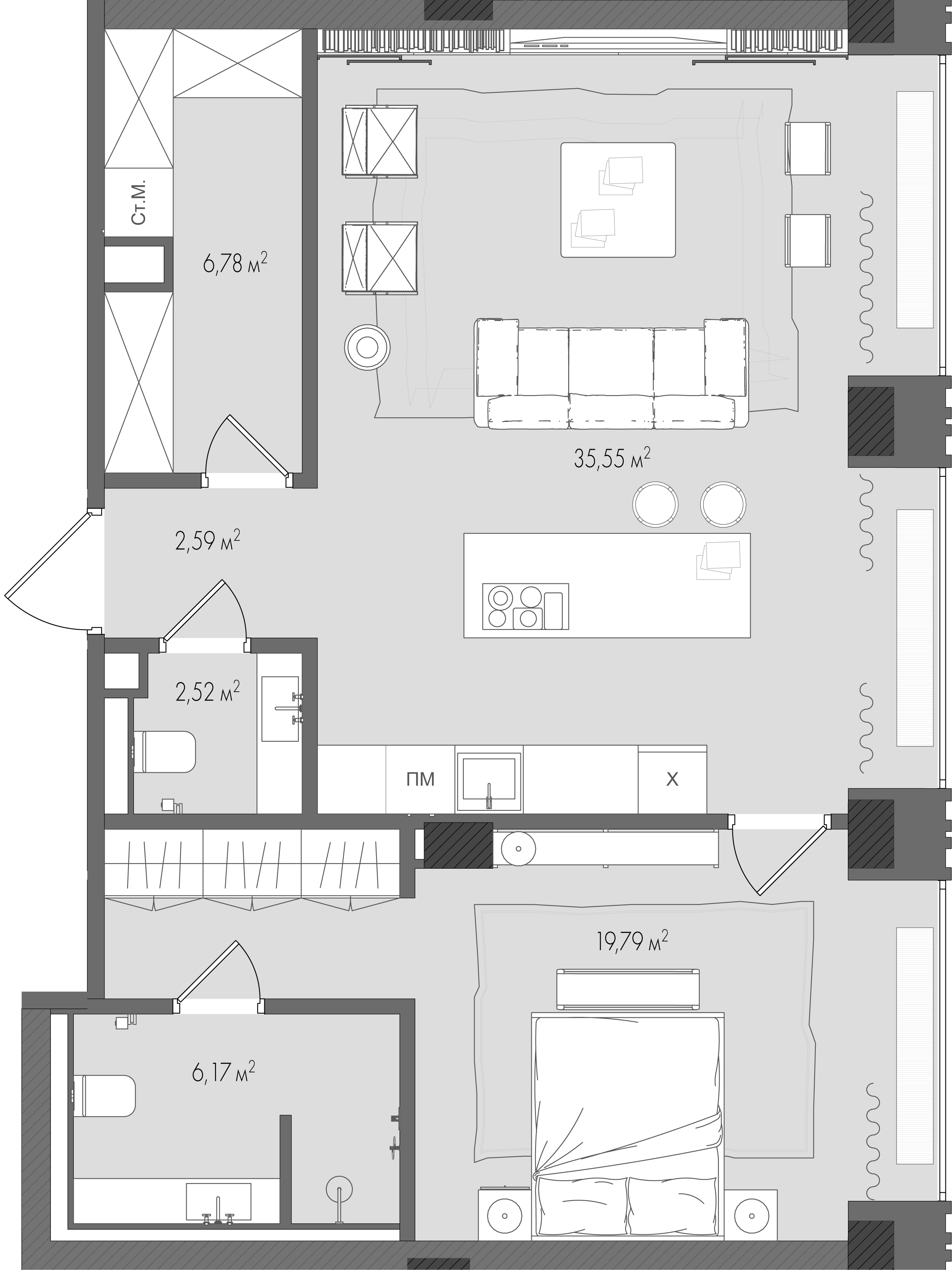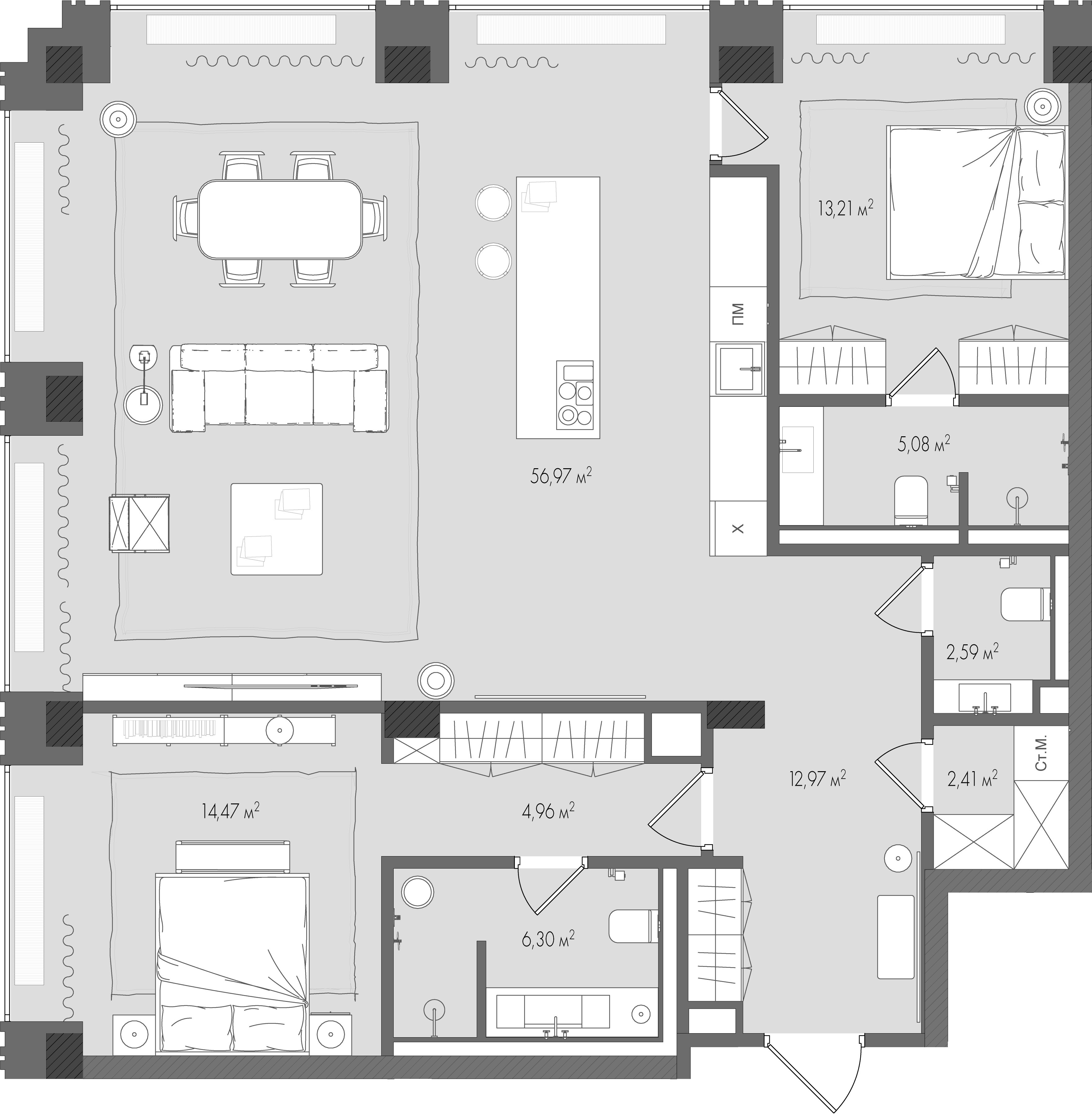 Минимальная площадь: 73,5 м² Максимальная площадь: 170,5 м²