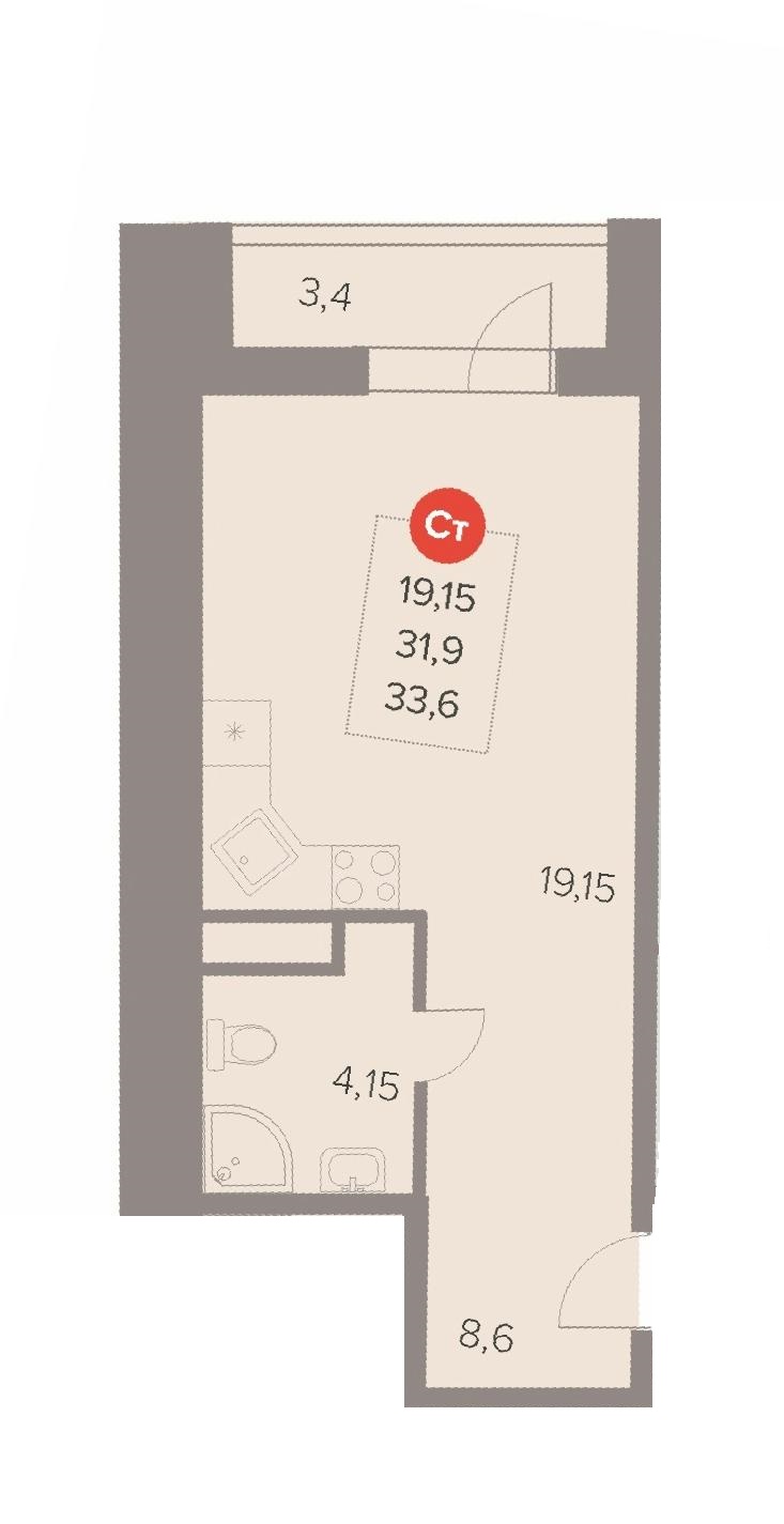 Студия · 34 м² · 16/22
