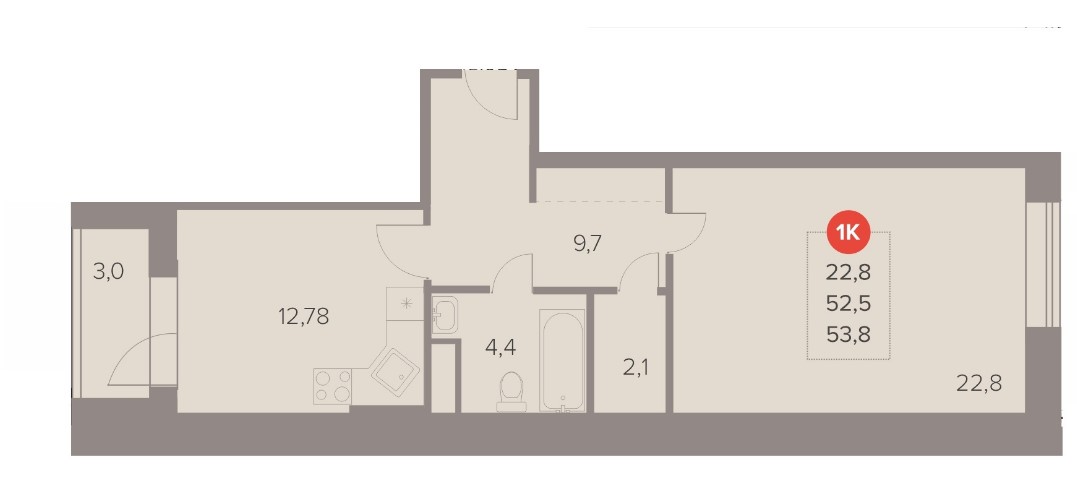 1-комн · 53 м² · 2/22