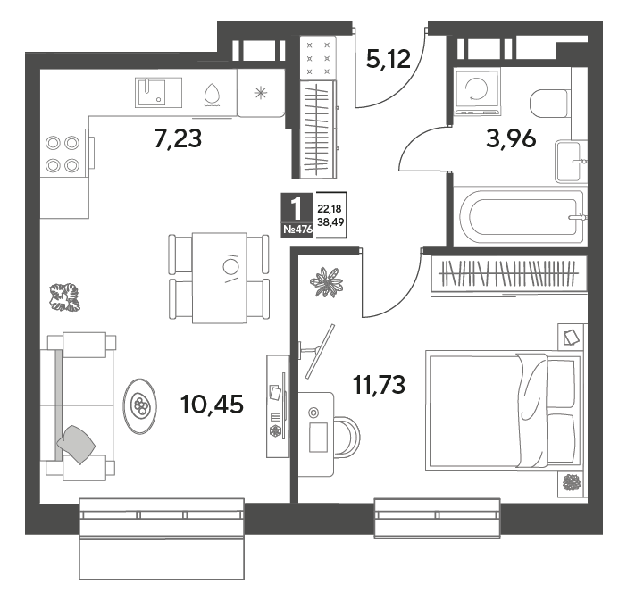 1-комн · 39 м² · 2/12