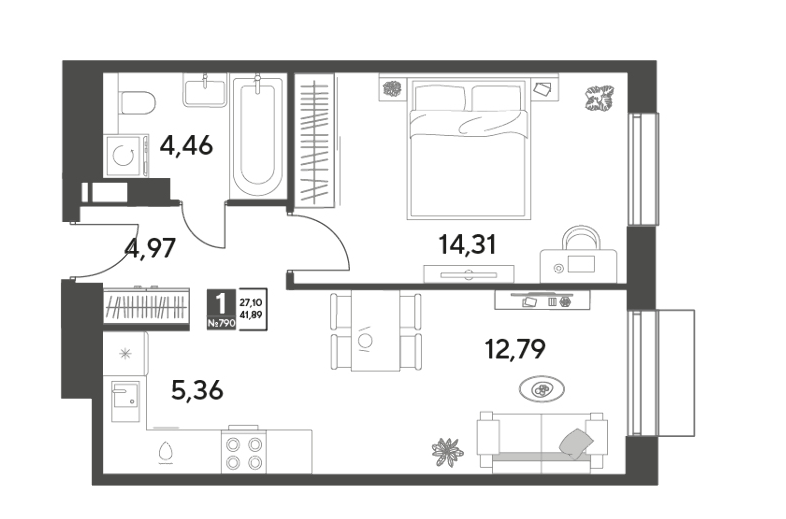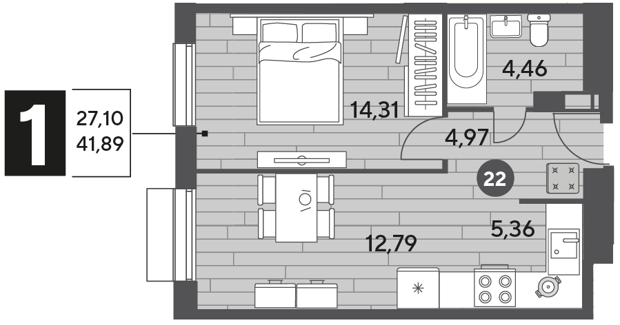 1-комн · 42 м² · 3/12