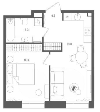 1-комн · 43 м² · 2/28