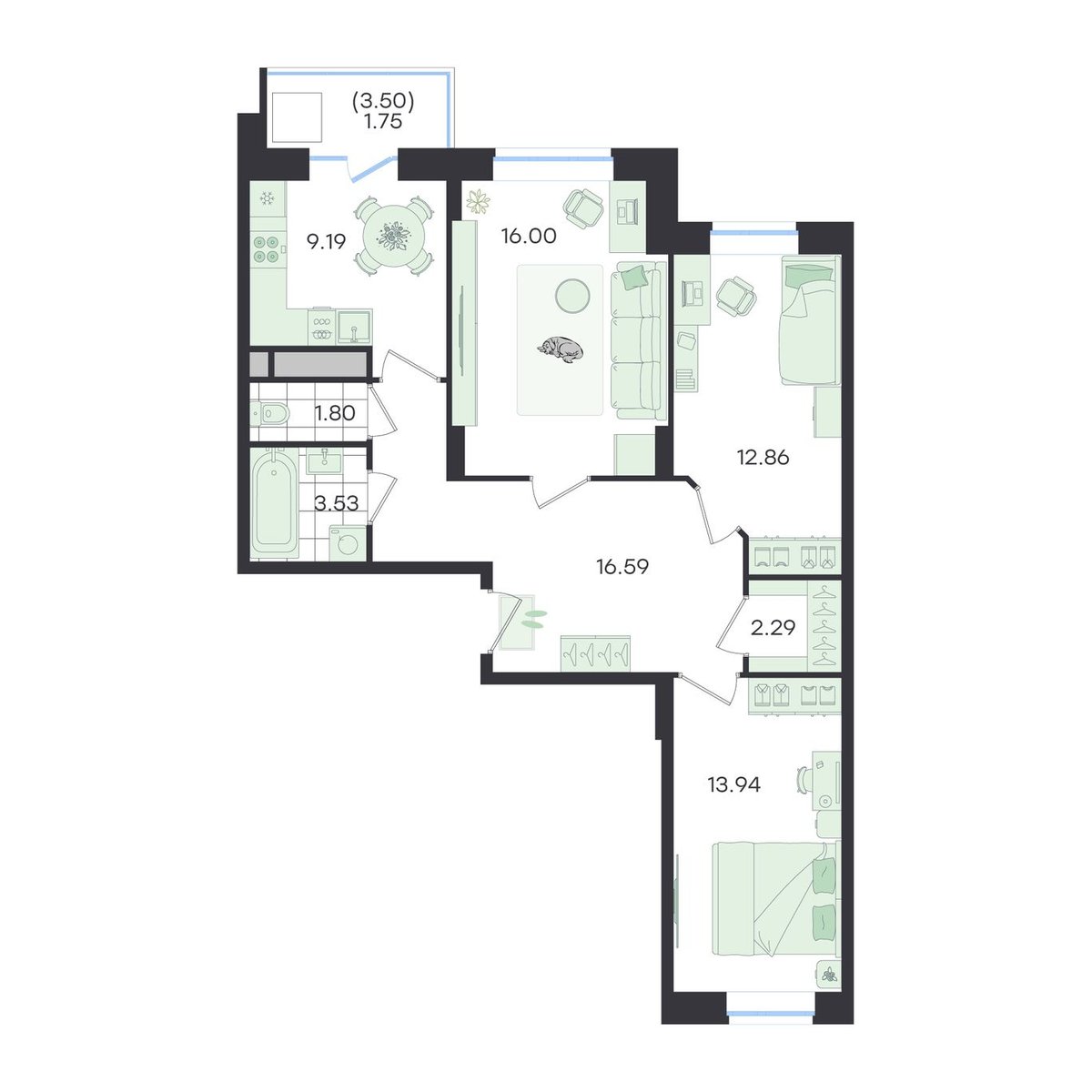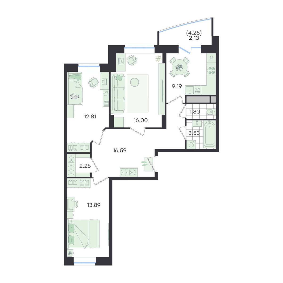 3-комн · 89 м² · 2/23